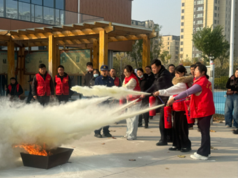 在实操演练环节,志愿者们在消防员的专业指导下,分组进行灭火器实战操作。从“提瓶身、拔保险销、握软管、压手柄”的规范动作,到对准火源根部精准喷射,大家反复练习、相互纠正,迅速掌握了灭火核心技能。白色干粉喷涌而出的瞬间,不仅是对操作技巧的检验,更是对守护生命责任的深刻体悟。
